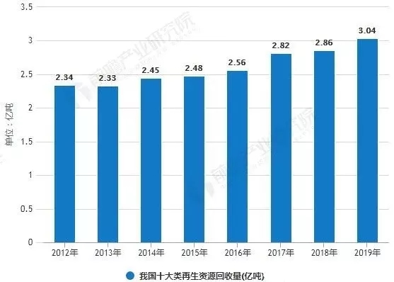 統(tǒng)計(jì)數(shù)據(jù)顯示,2012年我國(guó)再生資源回收量已達(dá)2.34萬(wàn)億噸,到了2016年我國(guó)再生資源回收量超2.5億噸。