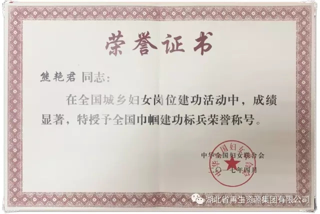 近期,中華全國婦女聯(lián)合會作出“關(guān)于表彰全國巾幗文明崗、全國巾幗建功標兵、全國巾幗建功先進集體的決定”(婦字〔2017〕17號),湖北省再生資源集團有限公司總經(jīng)理熊艷君同志被授予“全國巾幗建功標兵”榮譽稱號,這是我省供銷社系統(tǒng)中唯一獲此殊榮的先進個人,也是全省受表彰的30名先進個人之一。